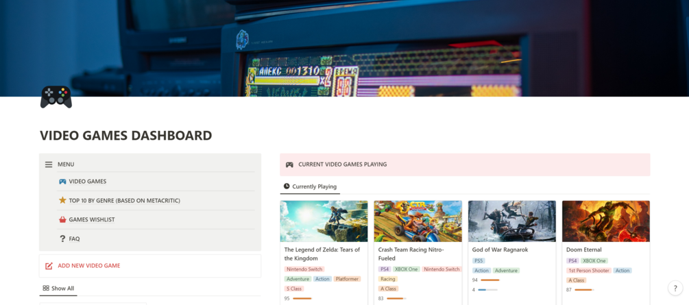 The Video Game Tracker for Notion has over 100s of video games stored in the database for you to check out.